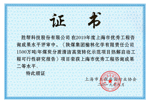 日前從上海市工程咨詢行業(yè)協(xié)會傳來喜訊,我司編制的《陜煤集團榆林化學有限責任公司1500萬噸/年煤炭分質(zhì)清潔高效轉(zhuǎn)化示范項目熱解啟動工程可行性研究報告》榮獲2019年度上海市優(yōu)秀工程咨詢成果二等獎。
