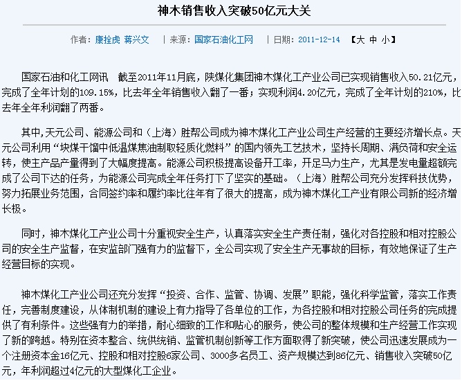 據(jù)國(guó)家石油和化工網(wǎng)訊 截止2011年11月底,陜煤化集團(tuán)神木煤化工產(chǎn)業(yè)公司銷(xiāo)售收入大增。其中,上海勝幫公司充分發(fā)揮科技優(yōu)勢(shì),努力拓展業(yè)務(wù)范圍,合同簽約率和履約率比往年有了很大的提高,成為神木煤化工產(chǎn)業(yè)有限公司新的經(jīng)濟(jì)增長(zhǎng)極。