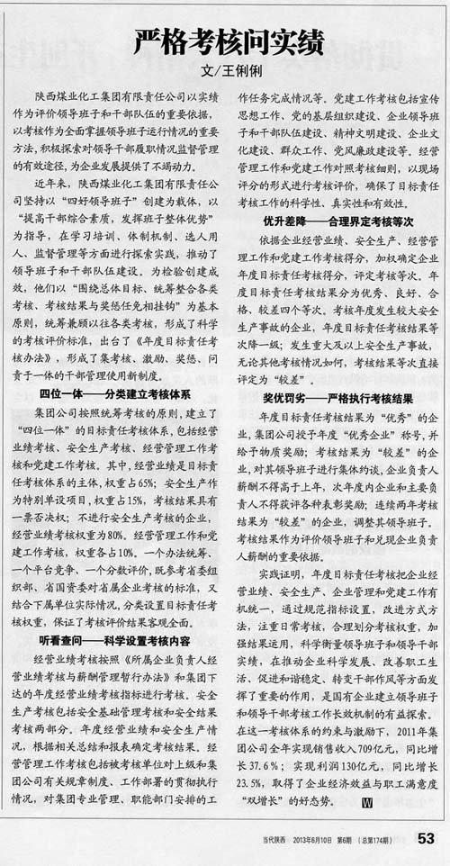 《當(dāng)代陜西》2013年6月10日第6期陜煤化集團(tuán)嚴(yán)格考核問實(shí)績(jī)陜西煤業(yè)化工集團(tuán)有限責(zé)任公司以實(shí)績(jī)作為評(píng)價(jià)領(lǐng)導(dǎo)班子和干部隊(duì)伍的重要依據(jù),以考核作為全面掌握領(lǐng)導(dǎo)班子運(yùn)行情況的重要方法,積極探索對(duì)領(lǐng)導(dǎo)干部履職情況監(jiān)督管理的有效途徑,為企業(yè)發(fā)展提供了不竭動(dòng)力。近年來,陜西煤業(yè)化工集團(tuán)有限責(zé)任公司堅(jiān)持以“四好領(lǐng)導(dǎo)班子”創(chuàng)建為載體,以“提高干部綜合素質(zhì),發(fā)揮班子整體優(yōu)勢(shì)…