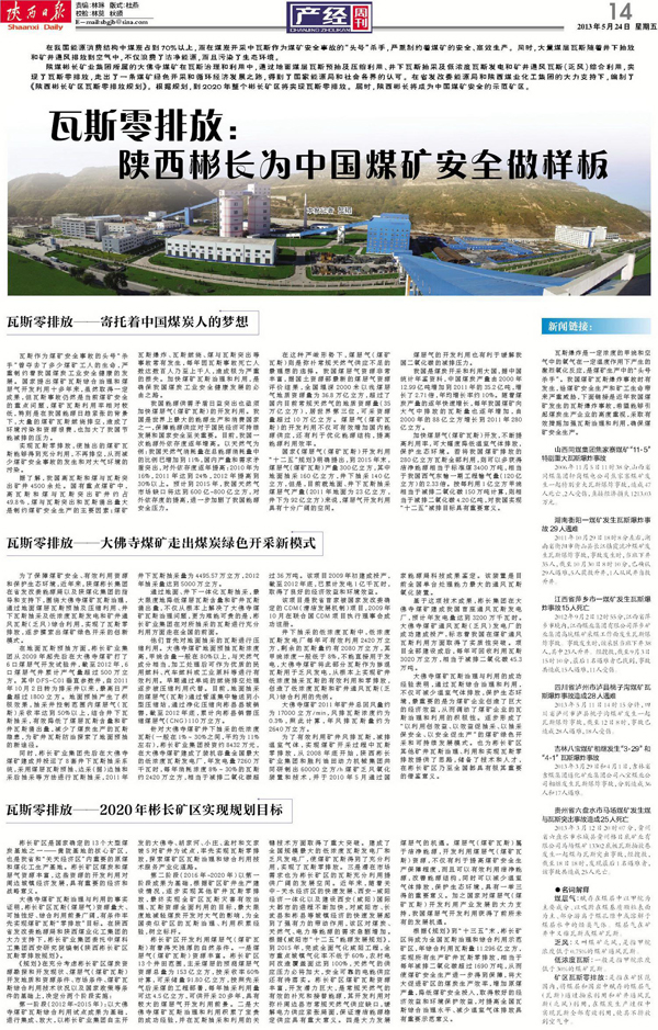 瓦斯零排放:陜西彬長為中國煤礦安全做樣板陜西日報(bào):2013年5月24日第14版 鏈接地址:http://esb.sxdaily.com.cn/shtml/sxrb/20130524/v14.shtml瓦斯零排放:陜西彬長為中國煤礦安全做樣板在我國能源消費(fèi)結(jié)構(gòu)中煤炭占到70%以上,而在煤炭開采中瓦斯作為煤礦安全事故的“頭號(hào)”殺手,嚴(yán)重制約著煤礦的安全、高效生產(chǎn)。同時(shí),大量煤層瓦斯隨著井下抽放和礦井通風(fēng)排放到空氣中,不…