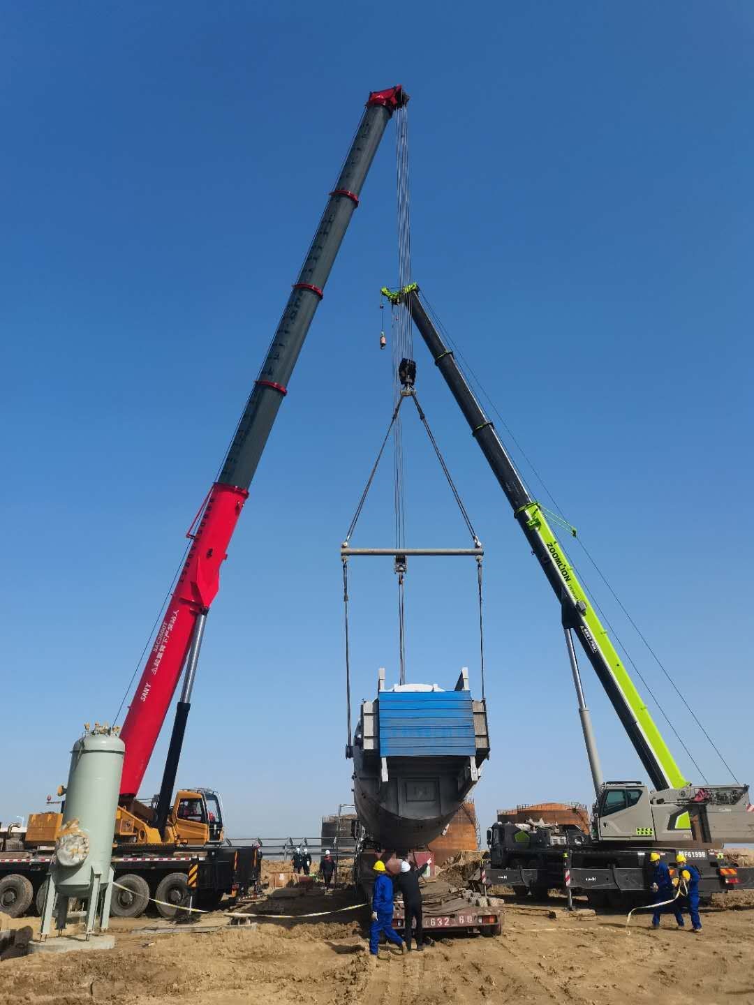 勝幫科技新天項目部精心組織、周密安排,提前協(xié)調(diào)各方完成爐體制造、運輸、吊車進場組裝、報驗,人員專項培訓(xùn)、交底等工作,對現(xiàn)場吊車站位及行走路線地基處理、承載力檢測、障礙物清理、設(shè)備基礎(chǔ)土建安裝交接等各環(huán)節(jié)進行全面有效管控,以SANY SAC2200T吊車為主吊,中聯(lián)ZTC800T吊車為輔吊溜尾,整體一次吊裝順利完成,安全就位,為后續(xù)大件吊裝工作奠定良好基礎(chǔ)。