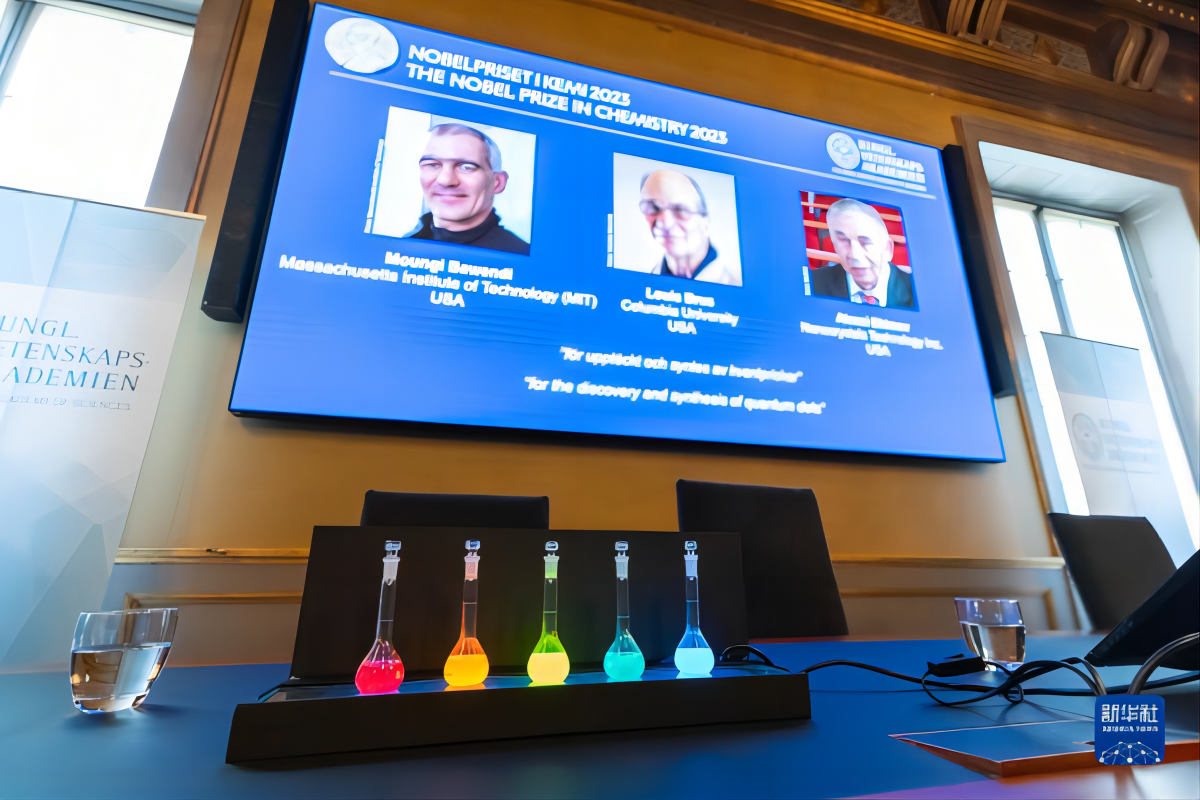 10月4日,在瑞典斯德哥爾摩的2023年諾貝爾化學(xué)獎(jiǎng)公布現(xiàn)場(chǎng),屏幕上顯示獎(jiǎng)項(xiàng)得主蒙吉·巴文迪(左)、路易斯·布魯斯(中)和阿列克謝·葉基莫夫的照片。新華社發(fā)(魏學(xué)超 攝)