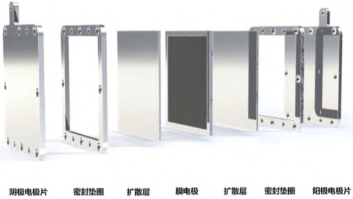 質子交換膜電解池主要由質子交換膜、催化劑和氣體擴散層組成的膜電極、雙極板和密封圈、防護片、端板等組成,如圖2.3-1所示。