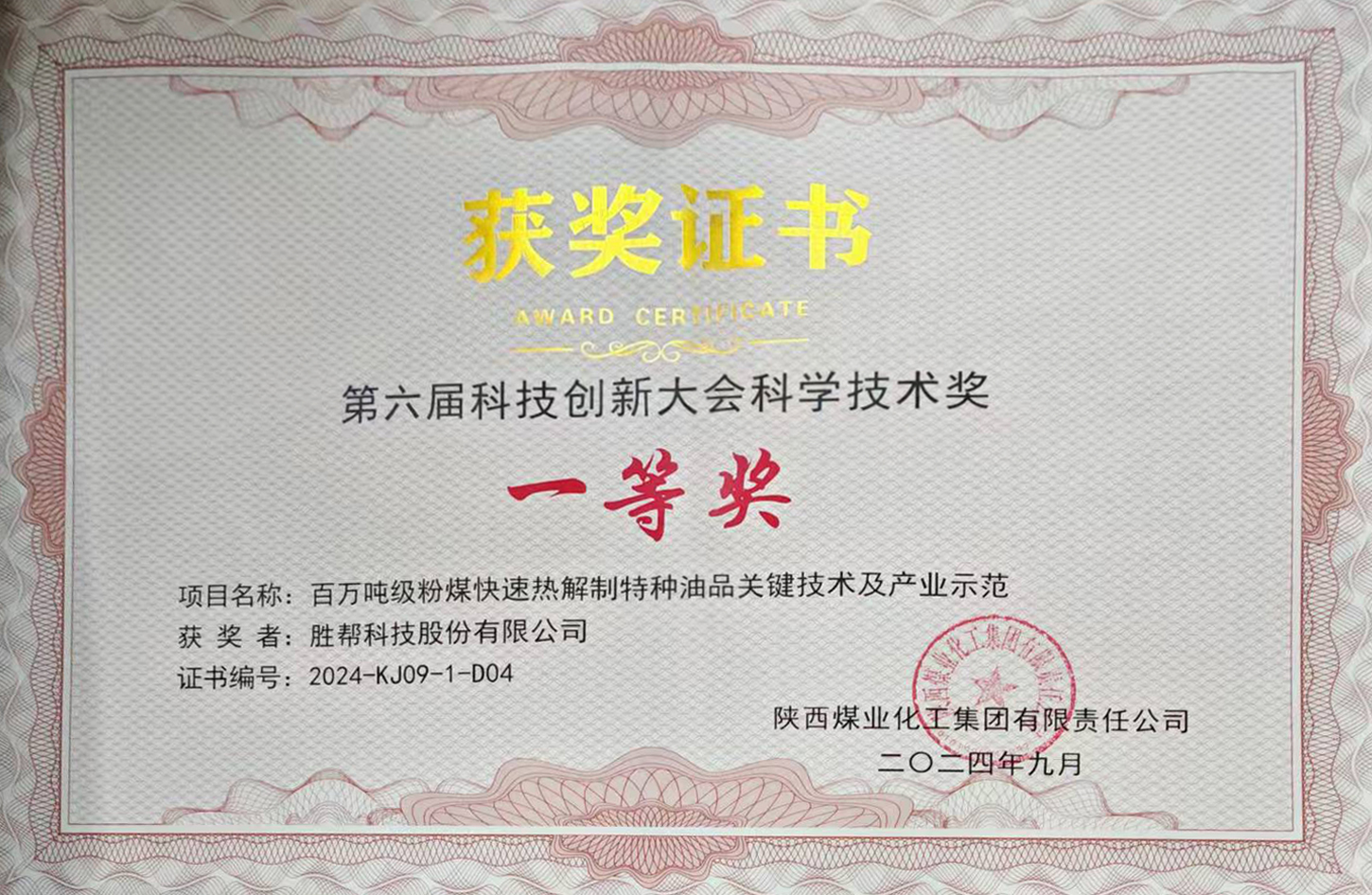 2024年9月2日,陜煤集團召開第六屆科技創(chuàng)新大會。勝幫科技股份有限公司和榆林化學等單位憑借《百萬噸級粉煤快速熱解制特種油品關(guān)鍵技術(shù)及產(chǎn)業(yè)示范》項目獲得陜煤集團2018-2023年科學技術(shù)獎一等獎。這一輝煌成績,是對勝幫科技股份有限公司全體科研人員長久以來辛勤耕耘的高度認可與褒獎。