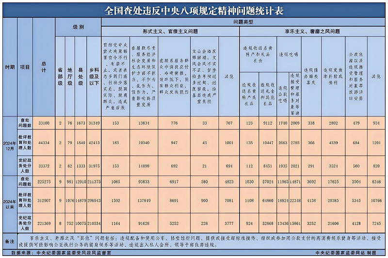 中央紀(jì)委國(guó)家監(jiān)委公布全國(guó)查處違反中央八項(xiàng)規(guī)定精神問(wèn)題匯總情況。2024年,全國(guó)共查處違反中央八項(xiàng)規(guī)定精神問(wèn)題225275起,其中,違規(guī)吃喝問(wèn)題占2024年度查處問(wèn)題總數(shù)的22.7%。