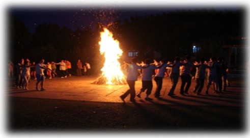 離開青山湖,大伙來到了西經(jīng)山。此山雖小,甚是難爬。其中,有一段168級的臺階,在山間繞了一圈,大伙兒滿頭大汗,有的衣服都濕透了,大家在半山腰休息,納涼。這時,天色已晚,工作人員將小廣場的火堆搭好,正在調(diào)試音響設(shè)備;啤酒小吃,自助燒烤也準(zhǔn)備就緒,工作人員在生炭火;師傅端上羊,指導(dǎo)我們烤全羊……