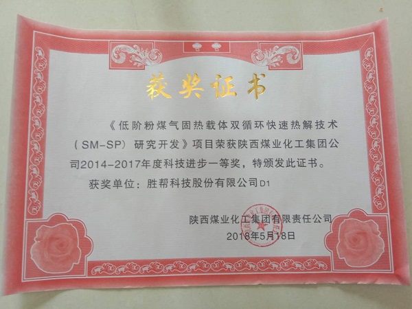 5月18日,陜煤集團(tuán)召開(kāi)第五屆科技創(chuàng)新表彰大會(huì)暨科技創(chuàng)新推進(jìn)會(huì),勝幫科技股份有限公司憑借“低階粉煤氣固熱載體雙循環(huán)快速熱解技術(shù)(SM-SP)研究開(kāi)發(fā)”項(xiàng)目,喜獲2014-2017年度創(chuàng)新成果類(lèi)—“科技進(jìn)步獎(jiǎng)一等獎(jiǎng)”。